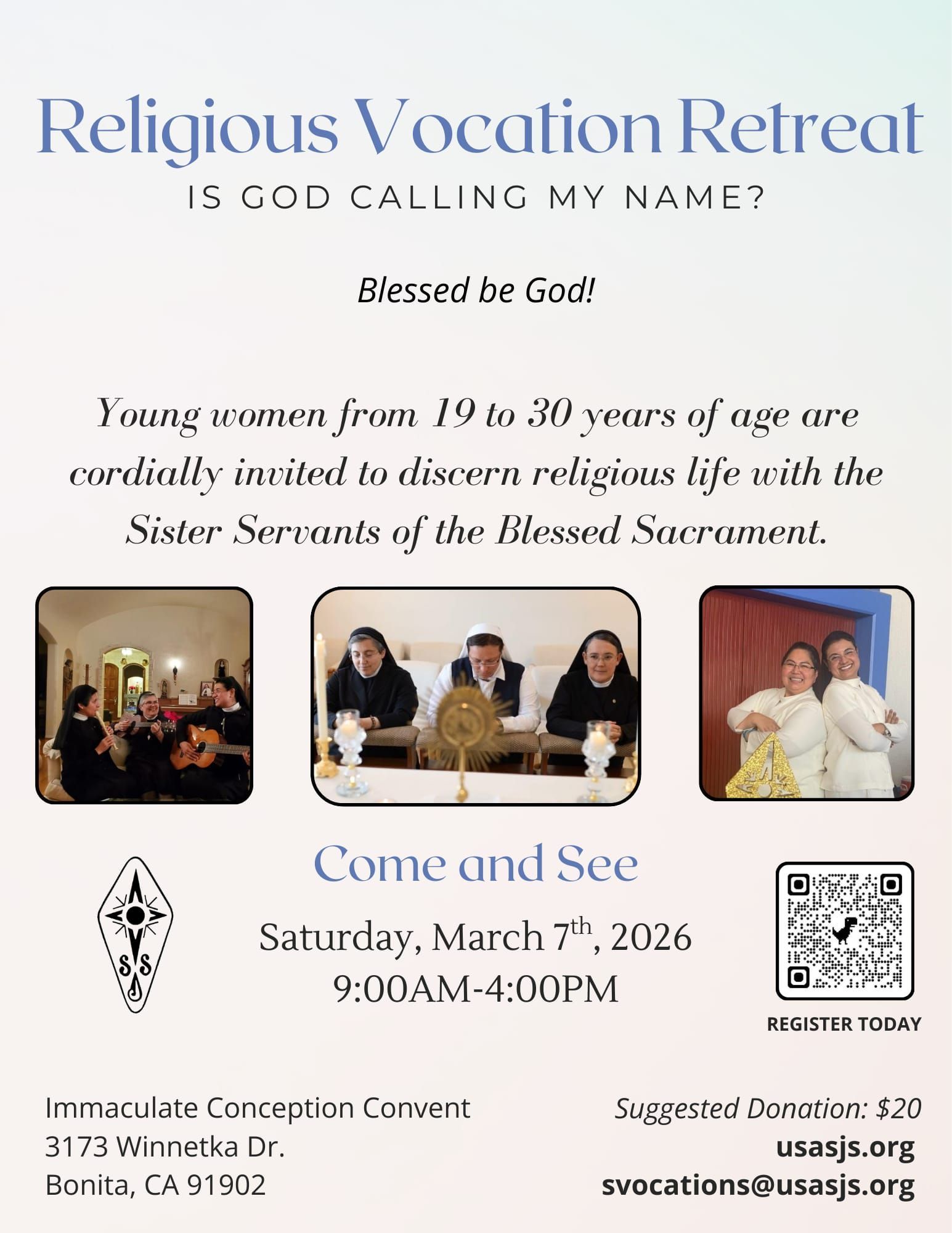 The Sister Servants of the Blessed Sacrament, a religious community devoting their lives to the adoration of the Holy Eucharist and Catholic education. The SJS designation originates from the name in Spanish- Hermanas Siervas de Jesús Sacramentado. For more than 115 years, the Sisters have shared a life of service and dedication in communities in the United States, Mexico, Central America, and South America.
